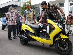 KUDUS, GROBOGAN.NEWS–Gubernur Jawa Tengah Ganjar Pranowo memamerkan motor listrik buatan pabrik elektronik asal Kudus, Rabu (3/11/2021).