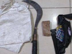 Sejumlah barang bukti yang ditemukan yakni satu buah tas pinggang warna hitam, berisi KTP, rokok, korek api dan obat sakit kepala puder cap 38 serta satu bilah sabit beserta sak plastik warna putih.